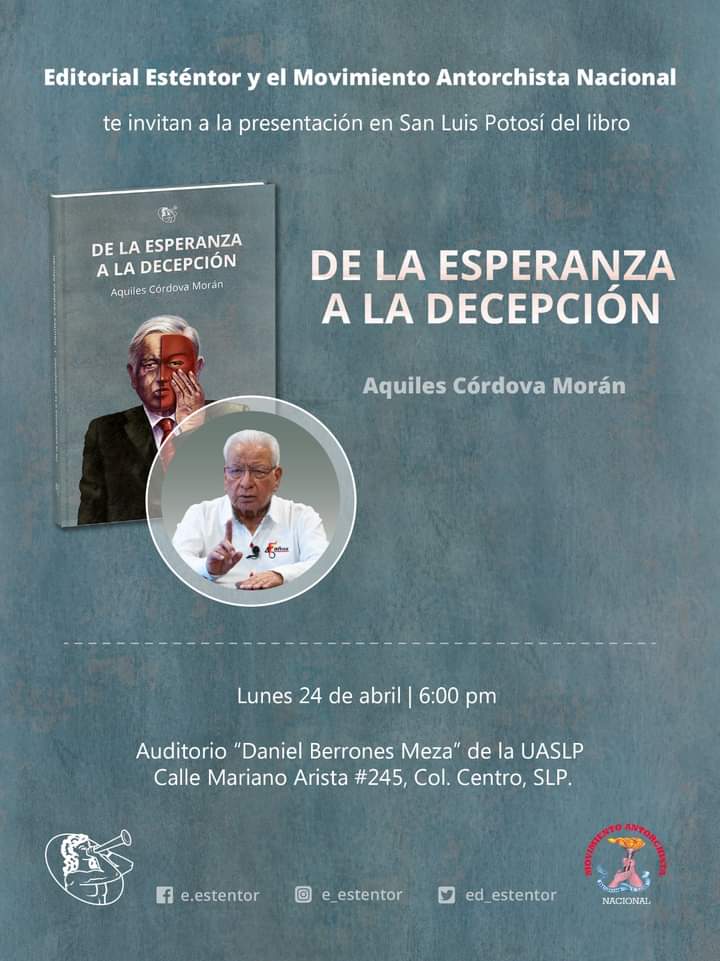 San Luis Potosí, SLP.- “De la esperanza a la decepción”, de Aquiles Córdova Morán, Secretario General del Movimiento Antorchista Nacional, será el nuevo libro que presentará la Editorial Esténtor hoy lunes 24 de abril, a las 6:00 de la tarde en el auditorio “Daniel Berrones Meza” de la Universidad Autónoma de San Luis Potosí (UASLP), ubicado en Mariano Arista No. 245, Centro Histórico.