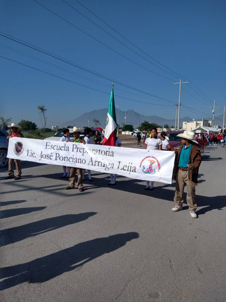 Noticias/ El Carme, N. L. Estudiantes de la preparatoria Lic. José Ponciano Arriaga Leija participaron en el desfile conmemorativo del 113 aniversario de la Revolución Mexicana.